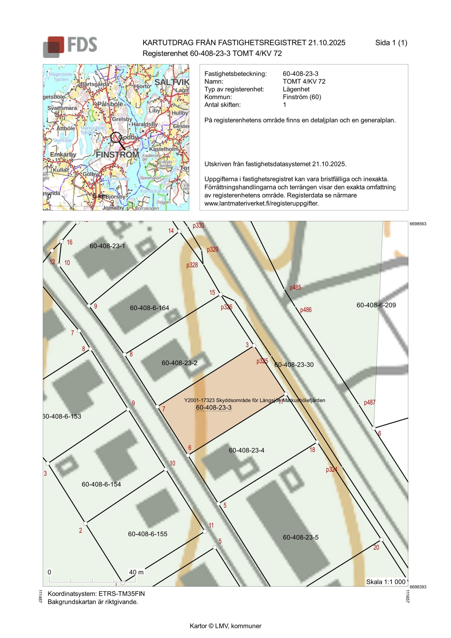 Fastighet: TOMT 4/KV 72 i Godby, Finströms kommun. Fastighetsbeteckning: 60-408-23-3.